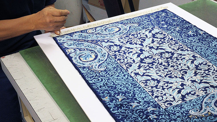 鏡の前でご自分に合う服を探すように、一つ一つのパーツを実際の絨毯に当てて選んでお作りすると、絨毯を引き立てて気持ちの良い額装になります