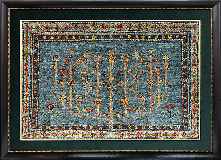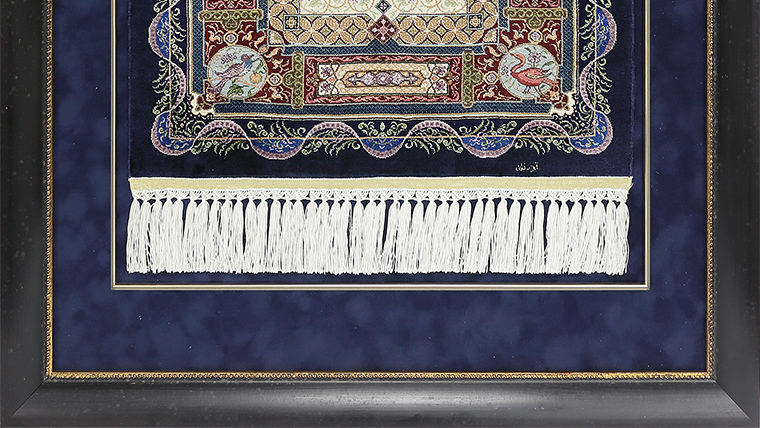 敷物にするには惜しい程綺麗な絨毯、額装で色や柄がさらに引き立ちます